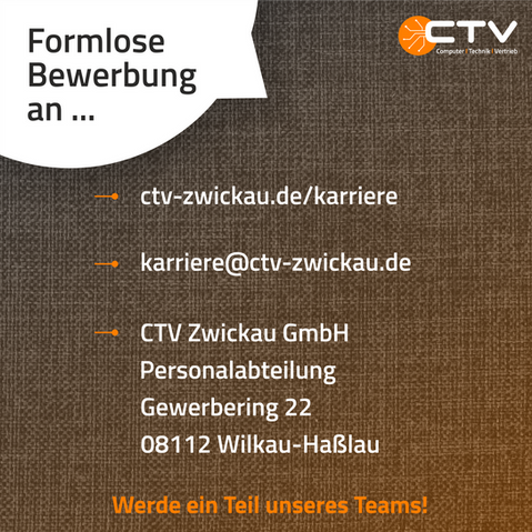 Senden Sie Ihre Bewerbungsunterlagen per Mail an: karriere@ctv-zwickau.de
